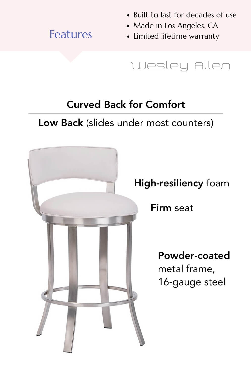 Its low back design is not only trendy, but allows for it to be tucked neatly under your bar or counter, optimizing your floor space.