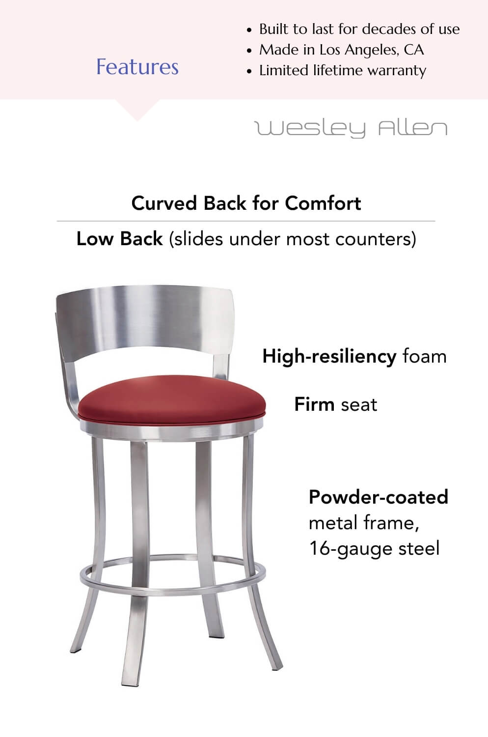 More than just a stylish element, the low back design of this stool is a practical feature that allows it to neatly slide under your bar or counter, maximizing floor space.