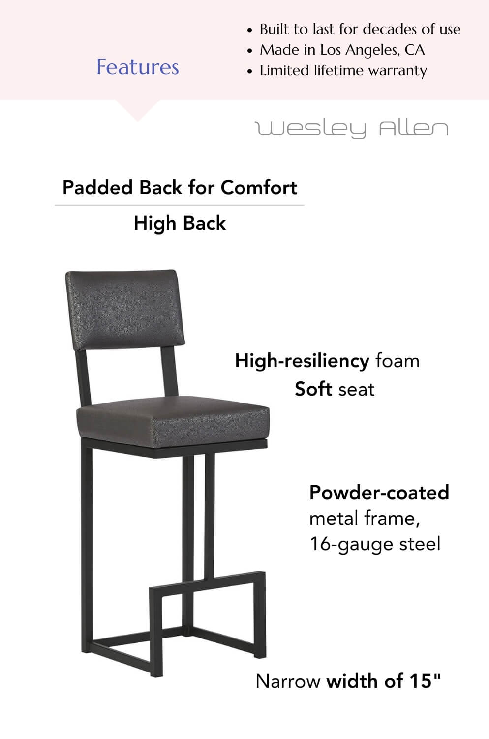 Exuding sophistication and a cutting-edge aesthetic, Wesley Allen’s Dumas bar stool seamlessly marries attitude and class, making it an ideal addition to any modern seating arrangement.