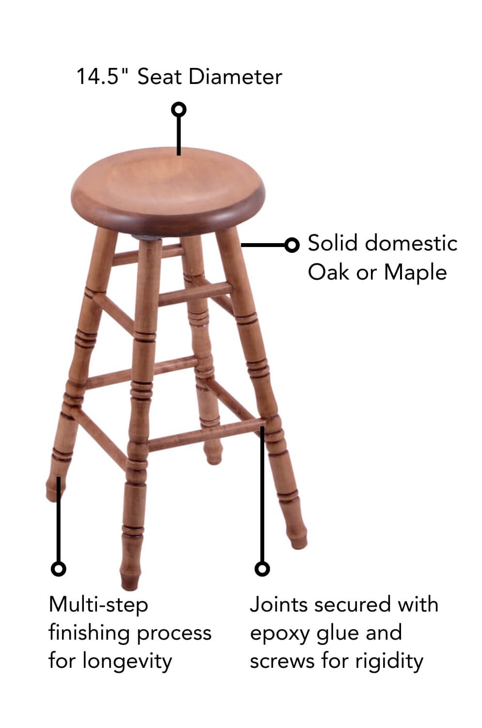 The Sadie backless wood bar stool is built by Holland Bar Stool Co. and features solid wood construction, a round cushioned seat, and classic turned legs.