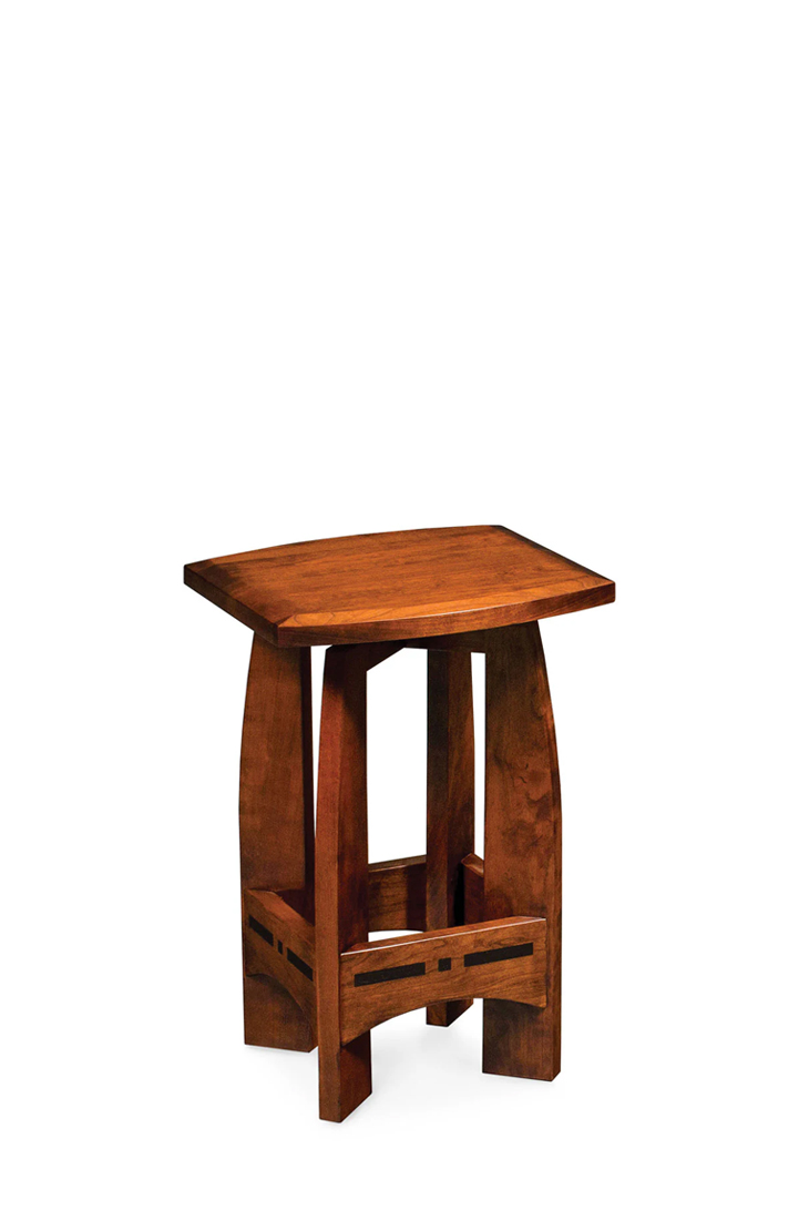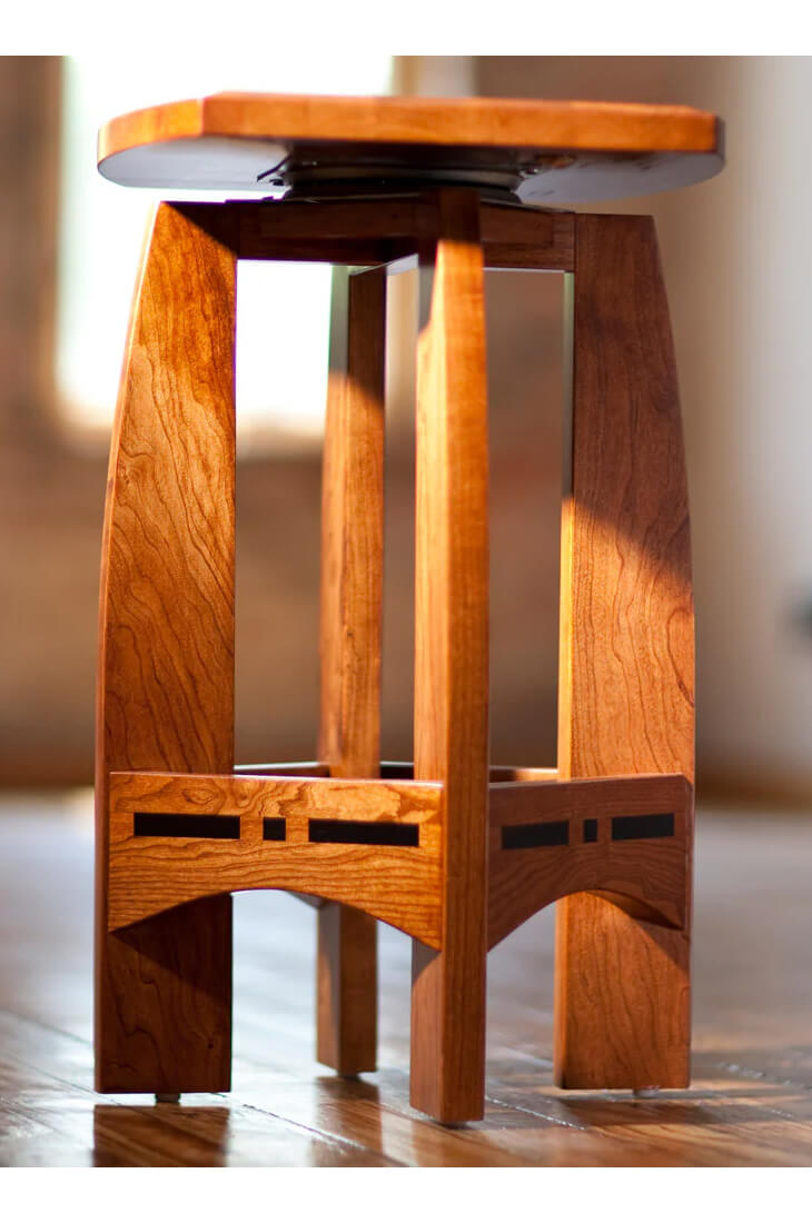 This backless wood stool carries the straight lines and honest craftsmanship of Mission and Craftsman furniture, while its geometric inlay detailing nods to the Prairie School influence of Frank Lloyd Wright.