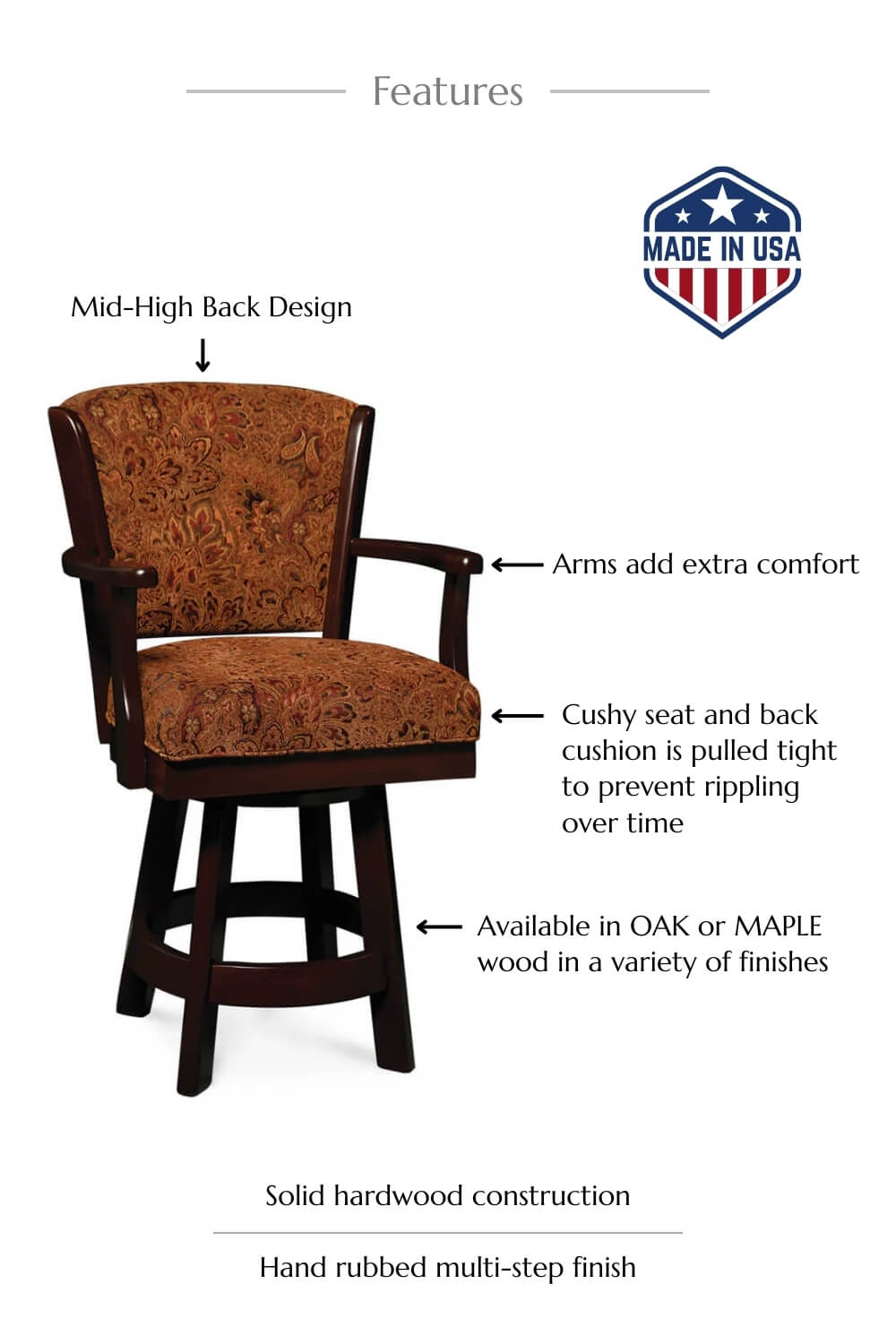 Plush comfort meets classic design in the Venture swivel bar stool. With its fully upholstered back, cushioned seat, and supportive arms, this stool is built for lingering conversations and everyday ease.